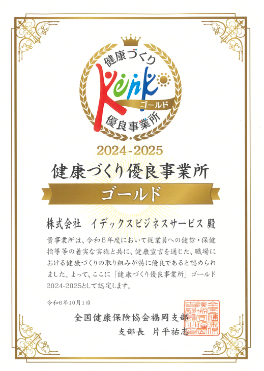 2024年10月1日イデックスビジネスサービスは、健康づくりに関する一定の基準を達成し、協会けんぽ福岡支部より「健康づくり優良事業所ゴールド」に認定されました。